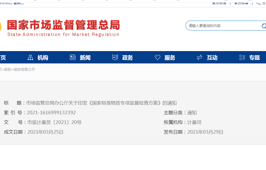市場監管總局辦公廳關于印發《國家標準物質專項監督檢查方案》的通知