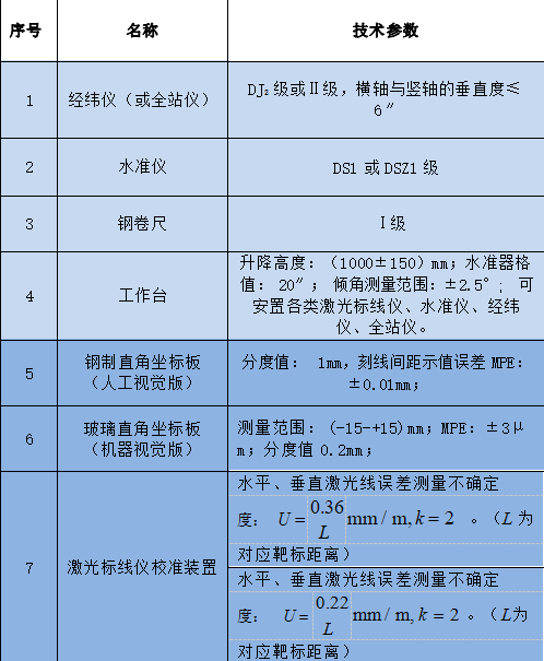 激光標(biāo)線儀校準(zhǔn)裝置主要技術(shù)參數(shù)如表 1 所示,校準(zhǔn)方式分為機(jī)器視覺和人工視覺兩種方法,表格中淺藍(lán)色部分為兩種校準(zhǔn)方式共用的儀器和技術(shù)參數(shù)。
