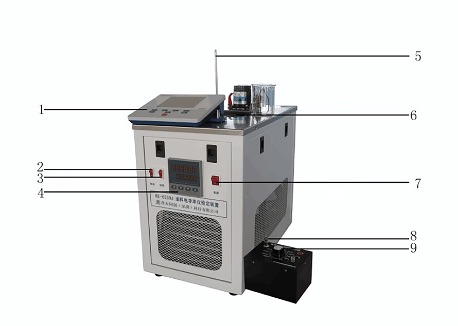1.電導率儀 2.制冷開關 3.加熱開關 4.溫度控制器 5.校準溫度計 6.燒杯 7.電源開關 8.TNC接口 9.電導率測定儀標準裝置