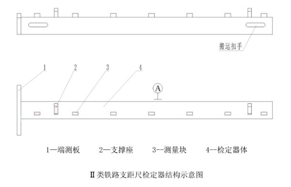 鐵路支距尺檢定器(以下簡稱檢定器)是用來檢定鐵路支距尺支距示值的專用檢具。它是利用端測板和若干個固定測量塊來完成對支距尺的長度示值及垂直度的檢定,利用檢定器體側平面A完成對支距尺長度方向的直線性的檢定。其結構示意見下圖。