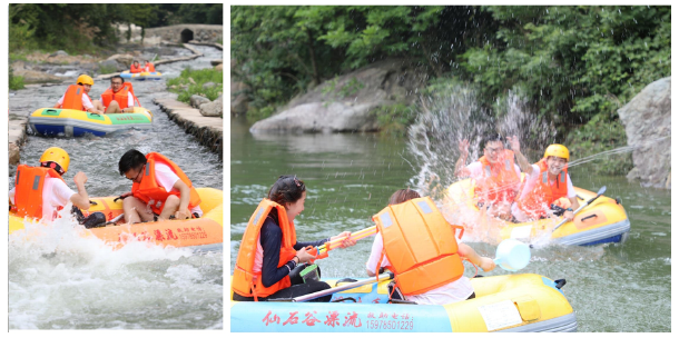 懸崖峭壁陡立,山巒跌宕,水道蜿蜒險(xiǎn)峻,水流急緩相見(jiàn)。員工們乘著皮筏順流而下,穿梭在蜿蜒流動(dòng)的河中,盡情享受著山水唯美的浪漫情調(diào),刺激的漂流也喚起了大家尋樂(lè)的童心,在河道中彼此你追我趕,飛濺的河水浸透了衣服,充分享受雨澆水淋的歡樂(lè)。兩個(gè)多小時(shí)的驚險(xiǎn)刺激漂流讓大家驚心動(dòng)魄、神情振奮、酣暢淋漓、叫人過(guò)癮。